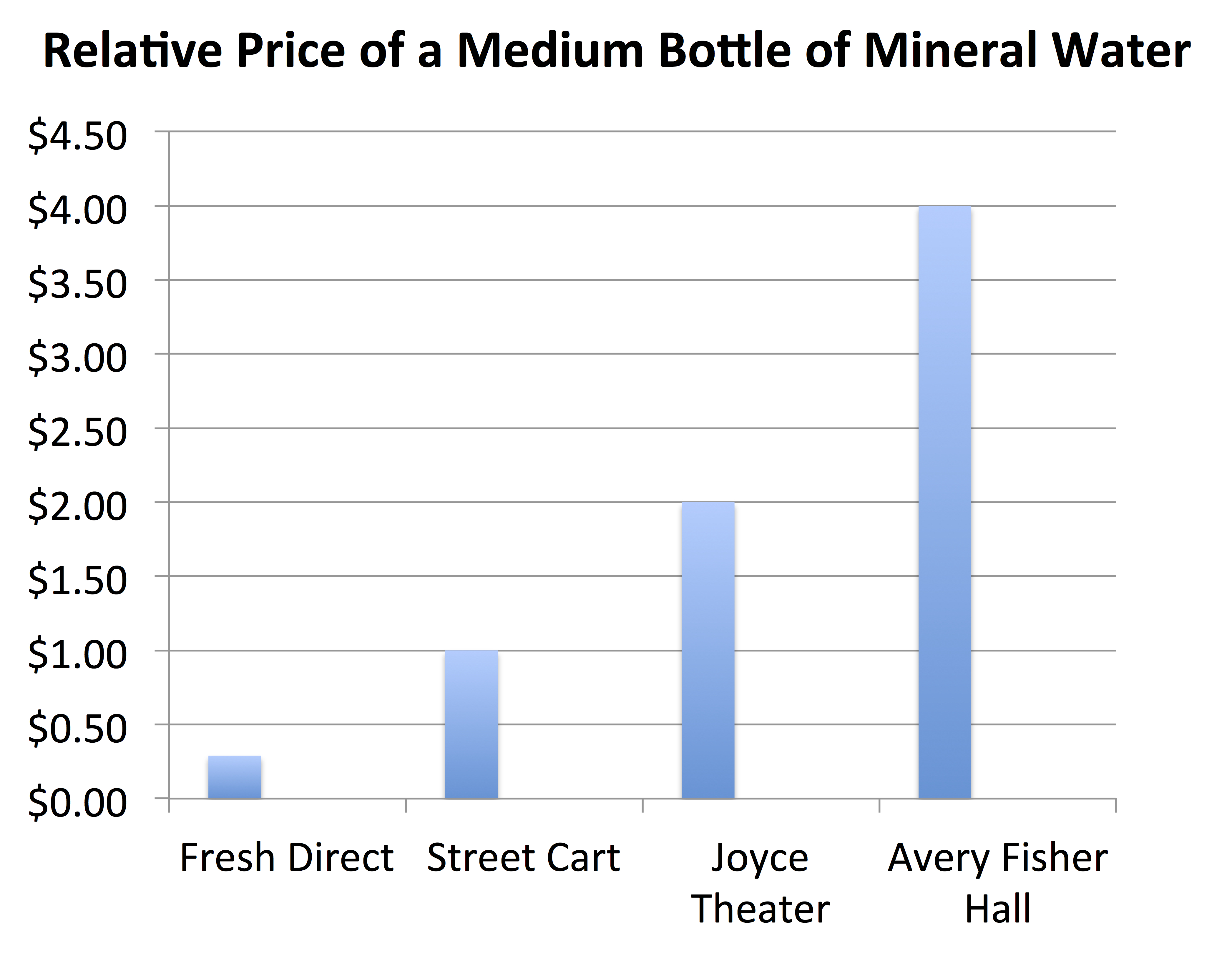 I was at a concert the other night at Avery Fisher Hall at New York City’s Lincoln Center, and decided to buy a bottle of mineral water at the bar. An 18-ounce, medium bottle was $4.00. I really didn’t think twice about the price (hey, this is New York!), although my wife suggested that the water fountain was a lot cheaper.