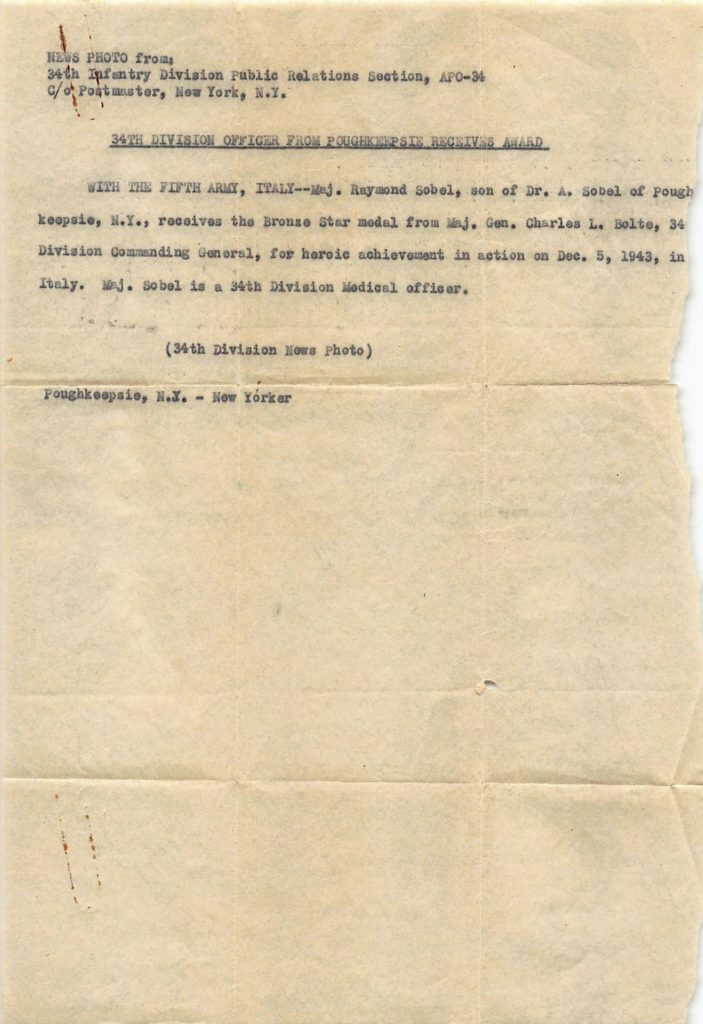 My father, Dr. Raymond Sobel, was a Major in the US Army and apparently spent more days in combat than any Army physician in the European theatre. The rest of this newsletter is drawn from one I published in 2009, after visiting him and discussing his wartime experiences. He had pulled out an envelope he had prepared and asked me to give it to our son Chris, who had recently returned from a combat deployment abroad. It contained letters he had sent home during the war and several photographs of him during the bloody Italian campaign of 1943-1945, during which there were 320,000 allied casualties including 50,000 dead. It was the most lethal campaign in the World War II European theater.