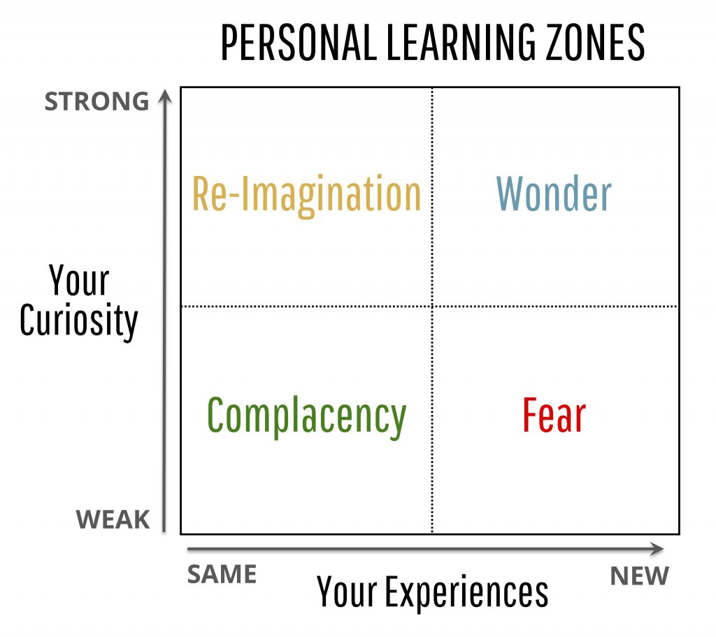 If you have the same experiences over and over, and are not very curious, you end up going through the motions and becoming inured to the activity. You’re in the Complacency quadrant, where you stop learning. It’s easy to get into this rut at work. We talk about “learning from experience,” but research shows that many people don’t actually learn from experience