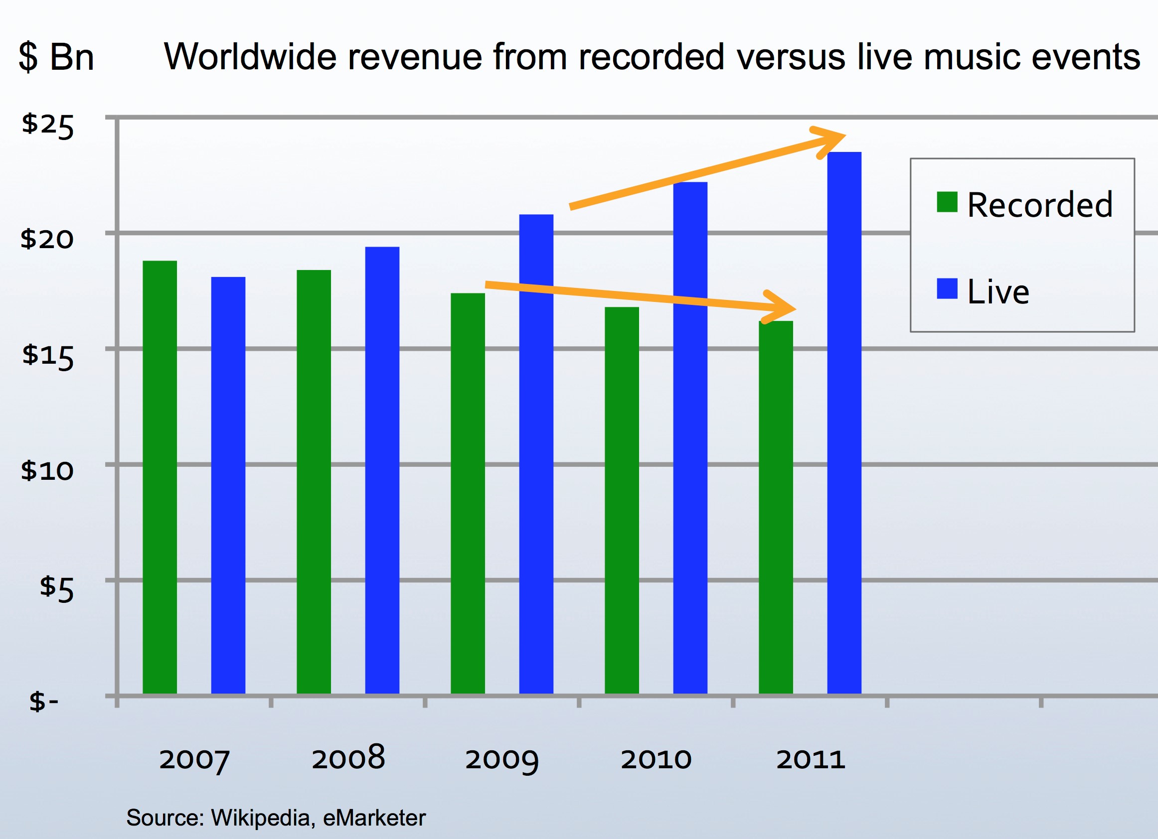 Look at the chart, below. Global sales of recorded music have steadily declined for a decade. Sales of tickets to live music events have steadily grown, however, and show no sign of stopping. The value of a CD or an MP3 recording, arguably, has gone down. The value of a great live performance—especially by a well-known artist—has gone up and up. Why? There are many reasons, but chief among them is the fact that there are many, many new substitutes for listening to recorded music (satellite radio, TV, the Internet, video games, etc.). But, there is really no substitute for an engaging, live performance.
